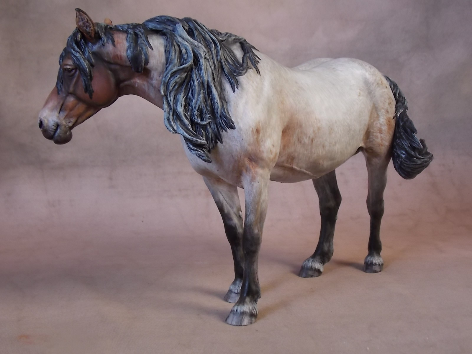 The journey in color began on both of these Sarah Mink "Elise" resins at just about the same time. One mare was being painted bay roan, while the other was being produced in a grulla. The nature of production on both these colors is based in glazing and both mares received many many coats of color by way of glazing techniques.