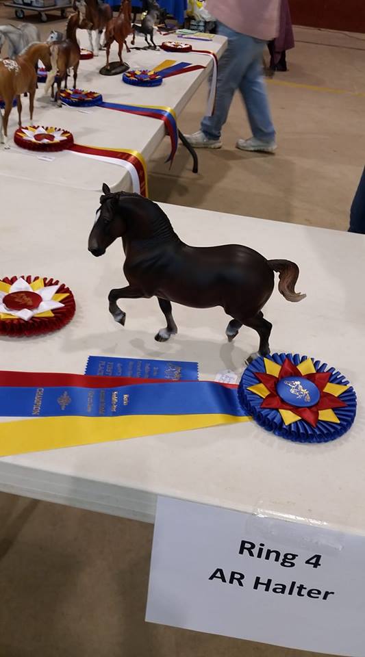 As the day progressed I sensed her disappointment. Shows can be disappointing when the steeds aren't in the top three, but she wasn't even close to 10th place. She had new stuff and the breed assignments seemed spot on. I quickly realized that there was no way in hell she could even place with her stable of new horses. How could a novice show against a OOAK Peter Stone OF? A Breyerfest model has no chance against a Breyer special run of 20.